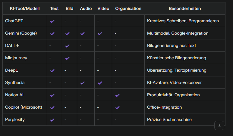 Es ist ziemlich schwierig, eine Übersicht über die wichtigsten KI’s zu erhalten. Julia Junge hat einige in einem Newsletter zusammengefasst.